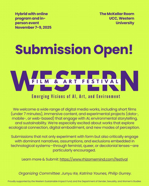 The Western Film & Art Festival (November 7–9, 2025) is a three-day public event, accompanied by an online program, that brings together artists, scholars, students, programmers, and community members to explore the intersections of artificial intelligence, digital art, and environmental awareness. Sponsored by the Western Sustainable Impact Fund and the Department of Gender, Sexuality, and Women’s Studies, the festival features screenings, experimental works, VR explorations, and creative as well as professional talks designed to foster dialogue on how emerging technologies are reshaping creative expression and ecological storytelling. The festival is now accepting submissions that present emerging visions of AI, art, and environmental storytelling.
