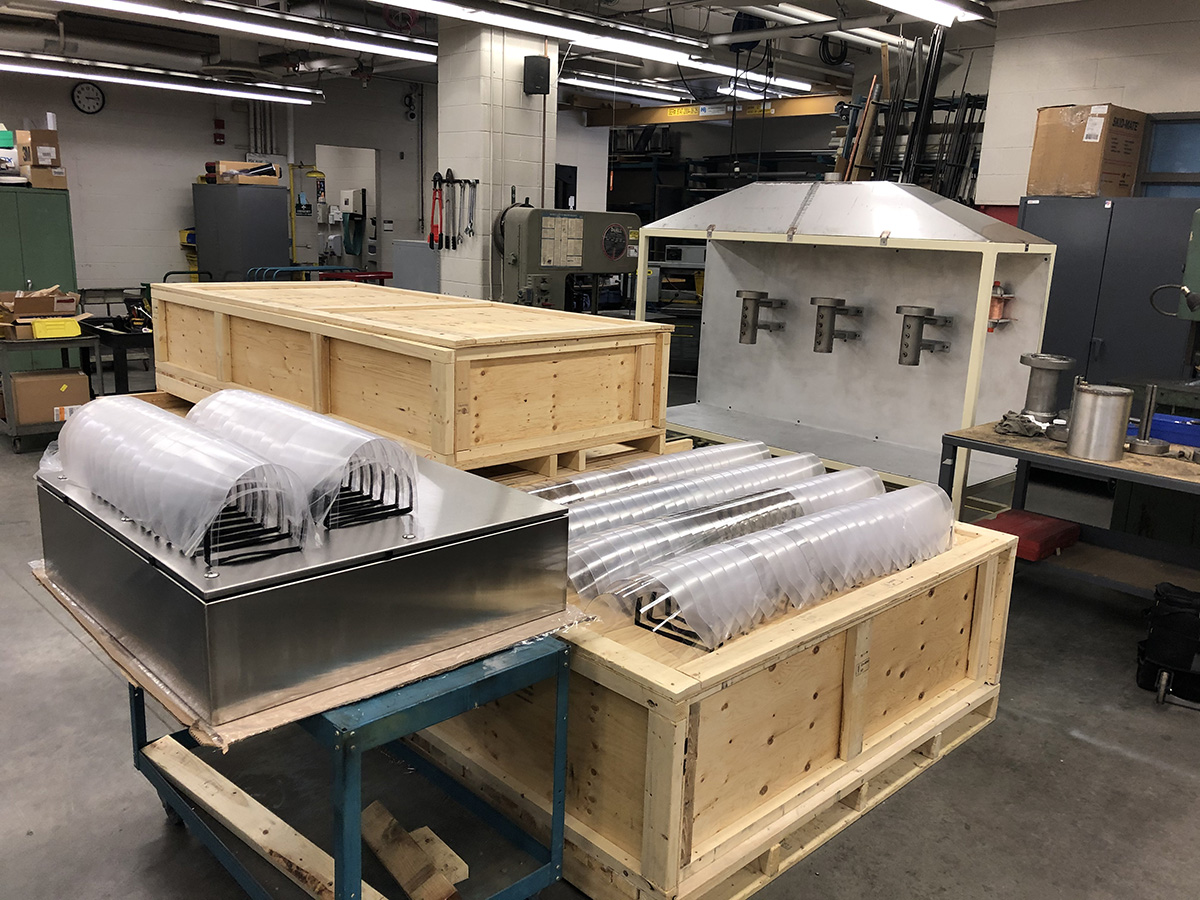 The advanced manufacturing team at University Machine Services (UMS) – an ancillary service based in Western Engineering – is shearing and forming polycarbonate (PETG) to create the shield and attaching Velcro fasteners, which were designed and 3D-printed by the Western Physics and Astronomy Machine Shop, to the completed masks to allow for adjustable head placement.