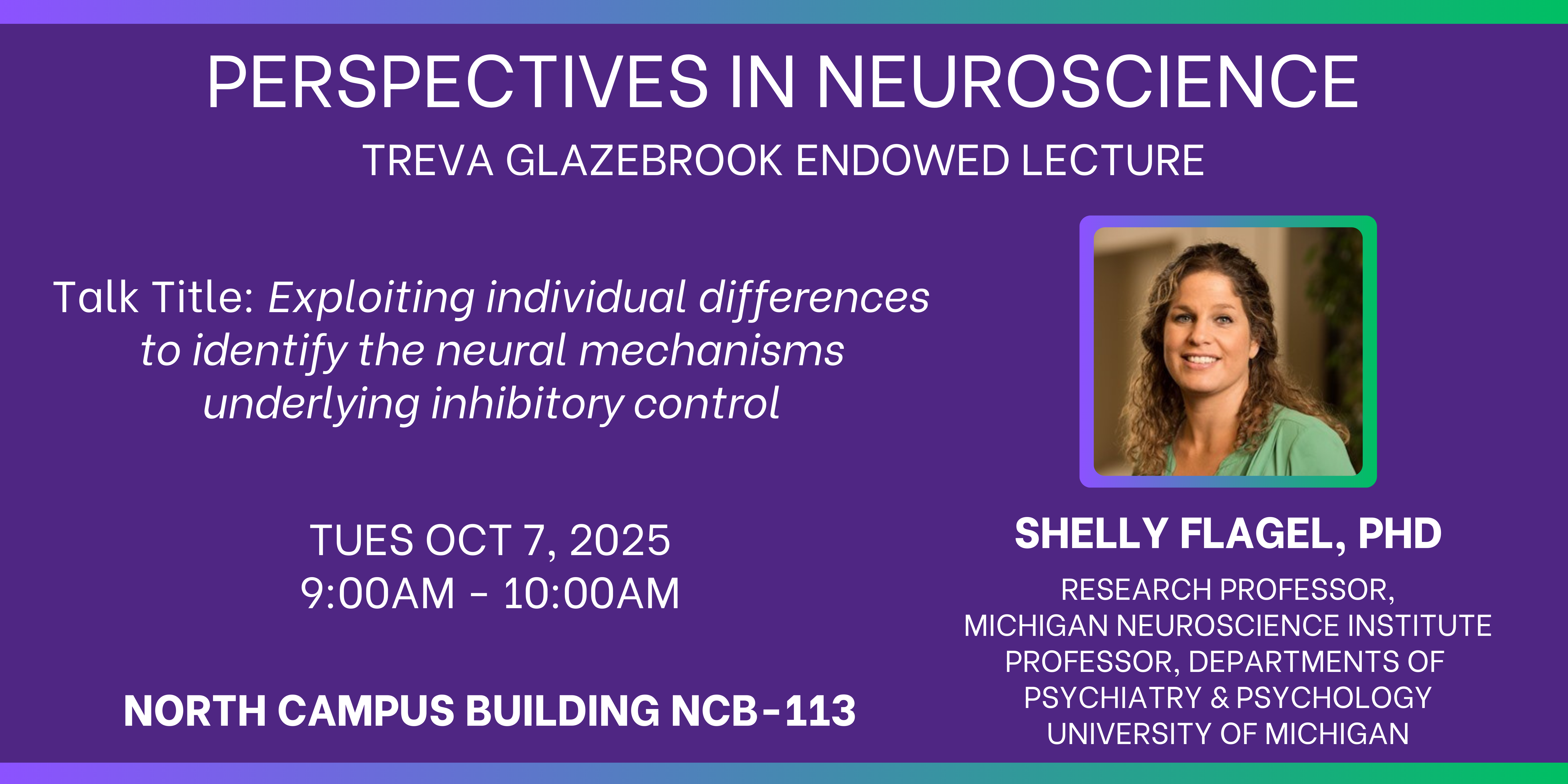 Dr. Flagel will be presenting a lecture titled "Exploiting individual differences to identify the neural mechanisms underlying inhibitory control"