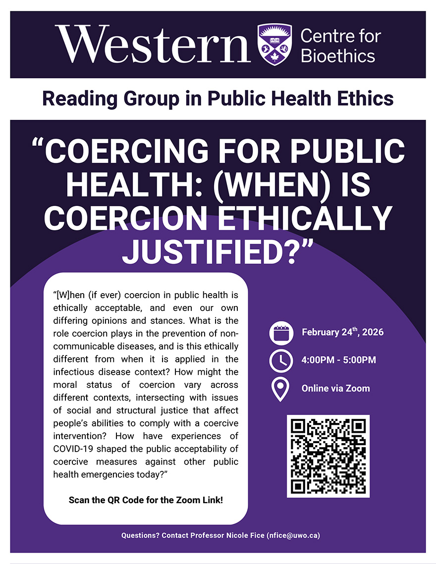 For the next meeting of the Centre's Public Health Ethics Reading Group, we will be discussing the paper, "Coercing for public health: (when) is coercion ethically justified?" by Tess Johnson, Safura Abdool Karim, Marlyn Faure, and Jonathan Shaffer. This editorial is part of a special issue of Monash Bioethics Review focusing on coercion in public health. The paper is attached to the newsletter.